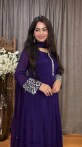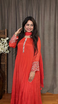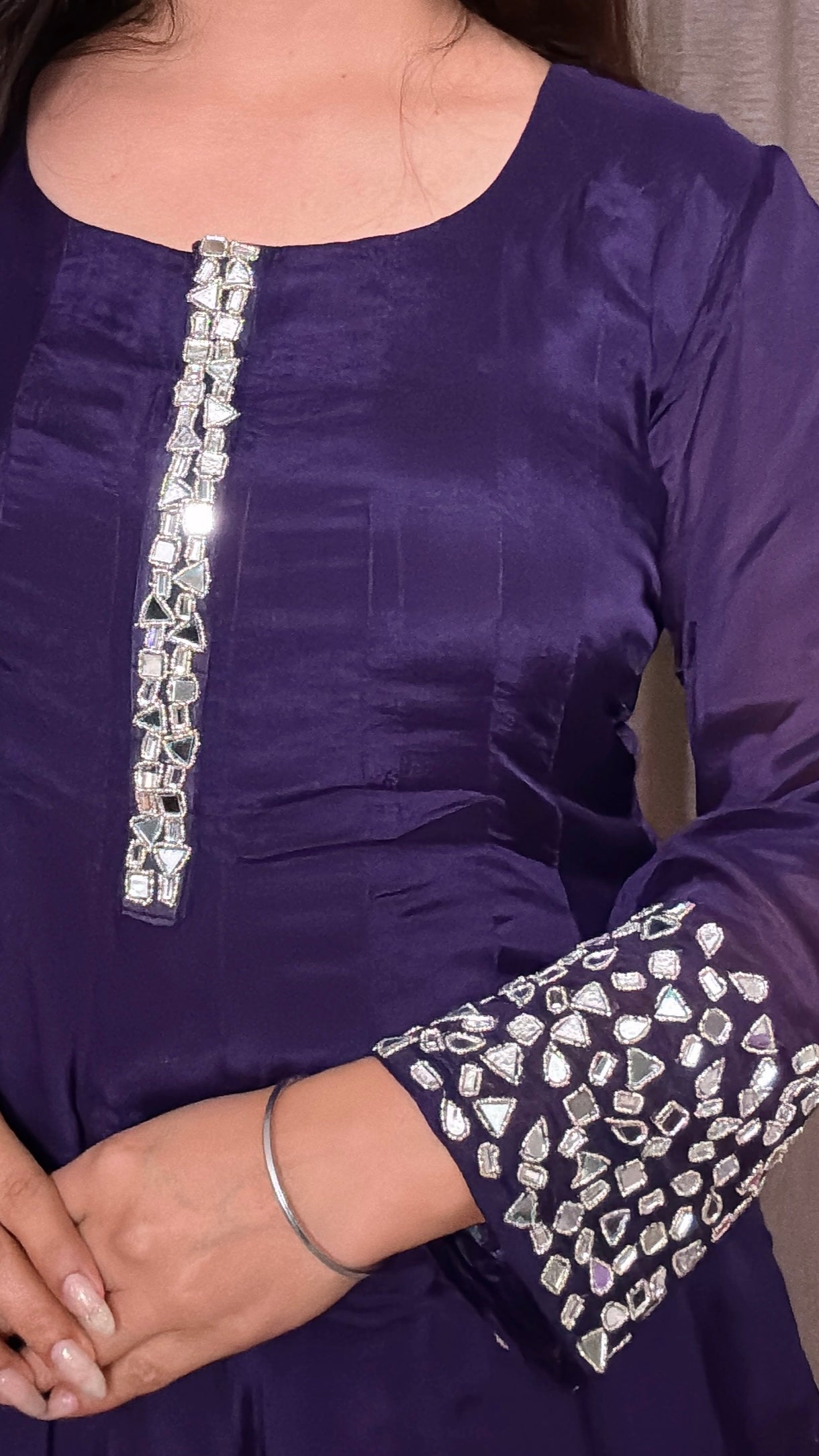 Step into timeless elegance with the Aarvi Chinon Mirror Anarkali Suit. Crafted in luxurious Chinon silk, this full-length Anarkali (52 inches) features exquisite real mirror detailing on the sleeves and neckline. Fully lined for comfort and drape, it is available in two regal shades – Violet and Coral. The flowing silhouette makes it a versatile choice for festive evenings, weddings, and special occasions.