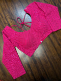 Georgette blouse with thread and sequins embroidery, styled with elegant 17-inch sleeves. Cropped 14.5-inch length, ready size 38 with stitched margin to adjust up to size 42. Available in pink—perfect for festive and party looks with sarees or lehengas.