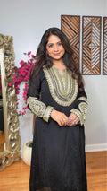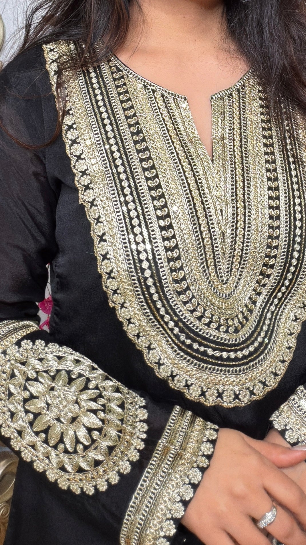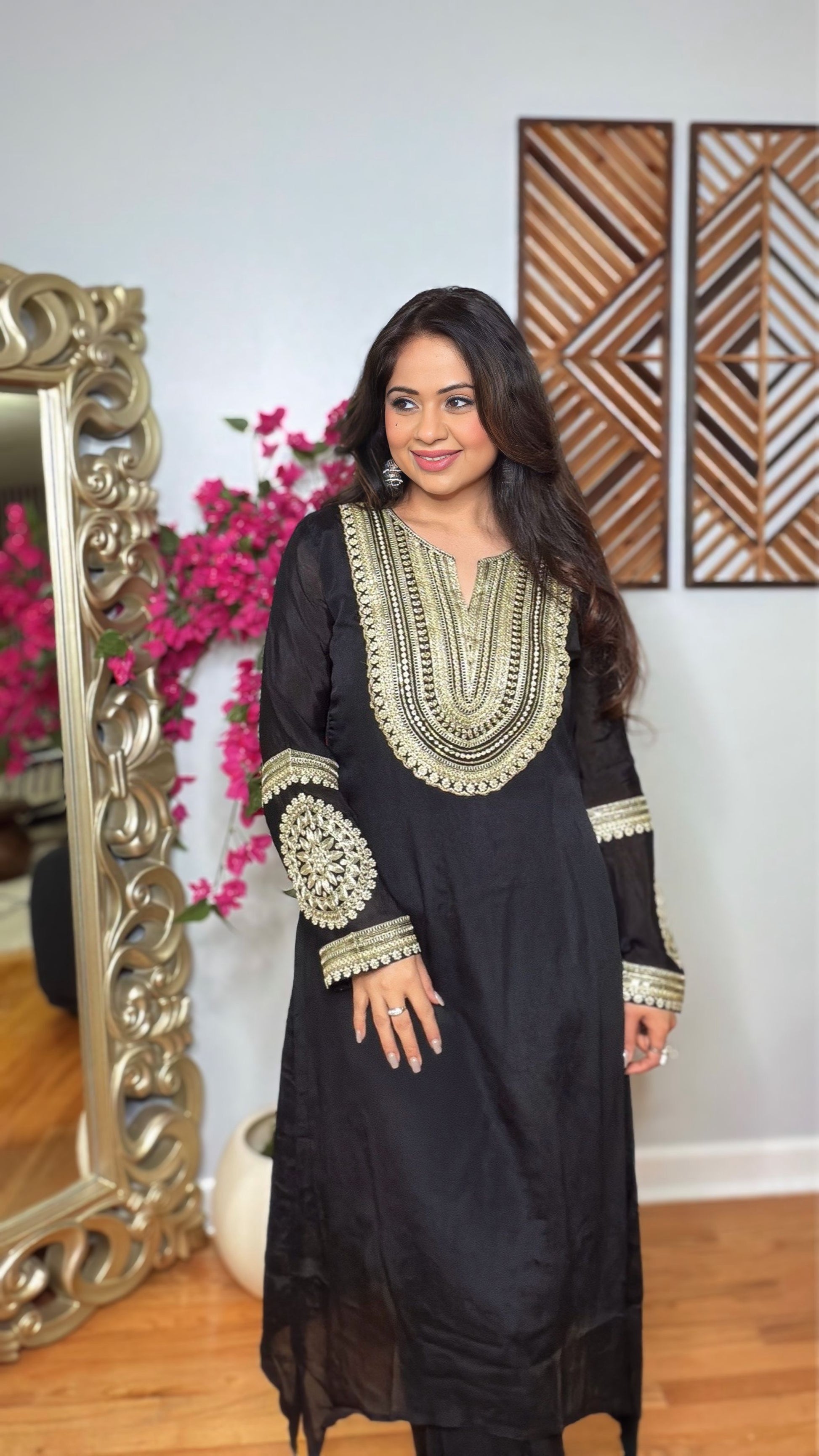 Step into timeless elegance with our Velmira Noir Zari Luxe Set, crafted in luxurious chinon silk for a soft, flowy drape. This all-black ensemble features intricate zari embroidery on the neckline and sleeves, adding a rich festive touch while maintaining a minimal, sophisticated look. Paired with matching bottoms and delicate tassel detailing, this outfit is perfect for evening gatherings, festive occasions, and elegant celebrations.