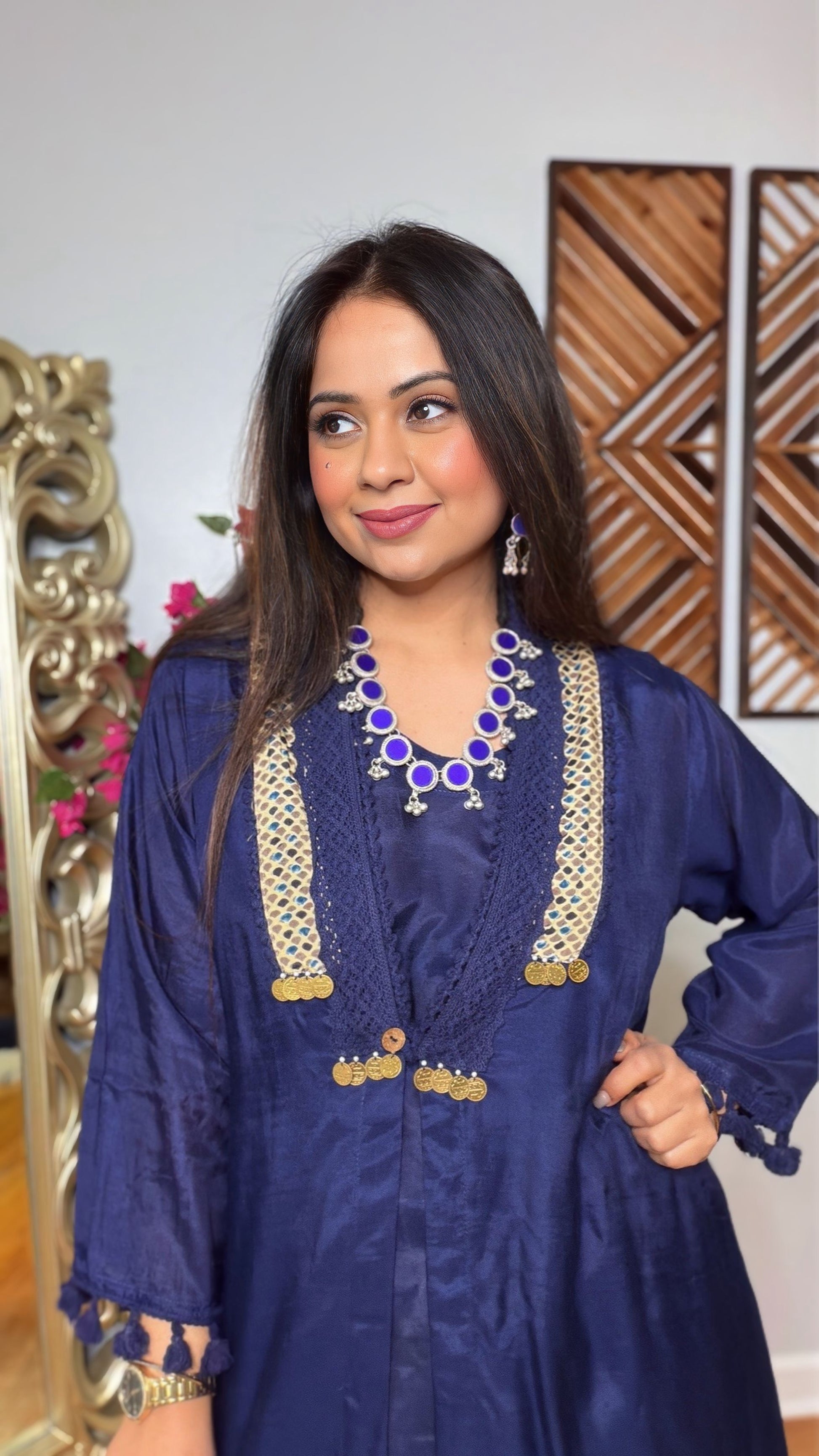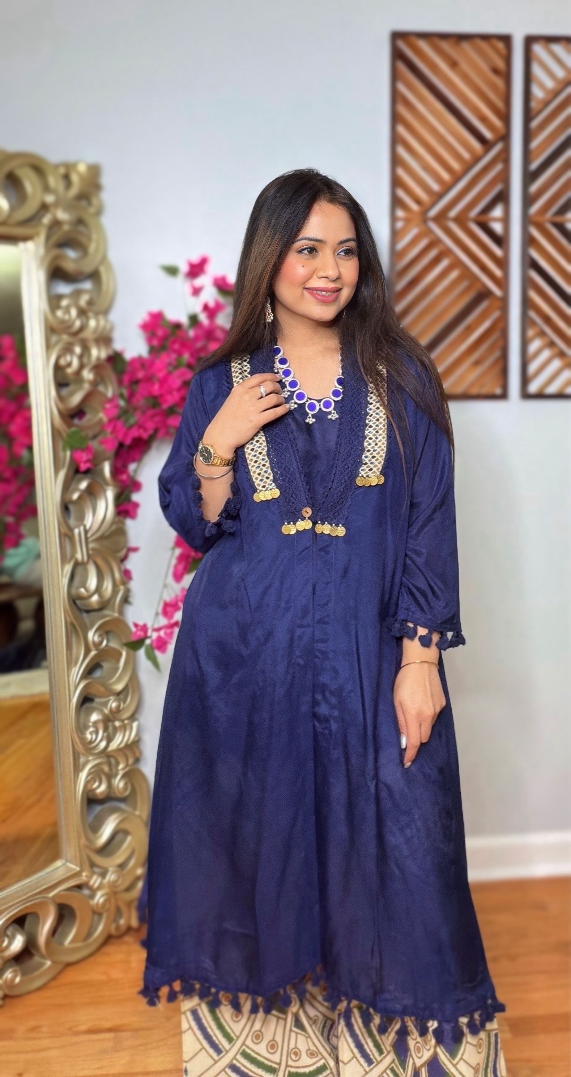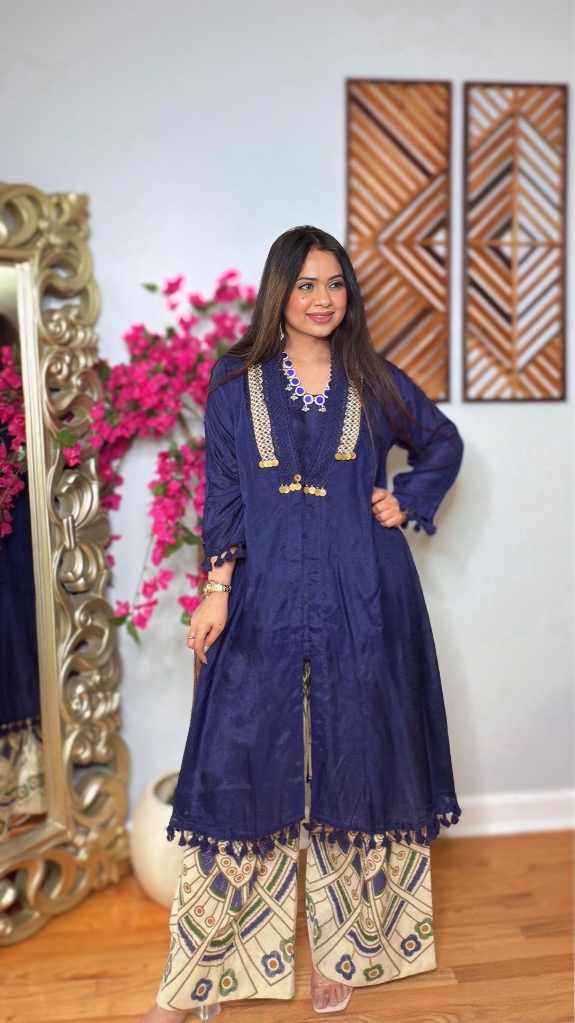 Step into effortless style with our Velmora Azure Coord Set, designed for modern women who love comfort with a statement touch. This stunning navy blue set features a flowy top paired with eye-catching printed palazzo pants, creating a perfect blend of elegance and ease.