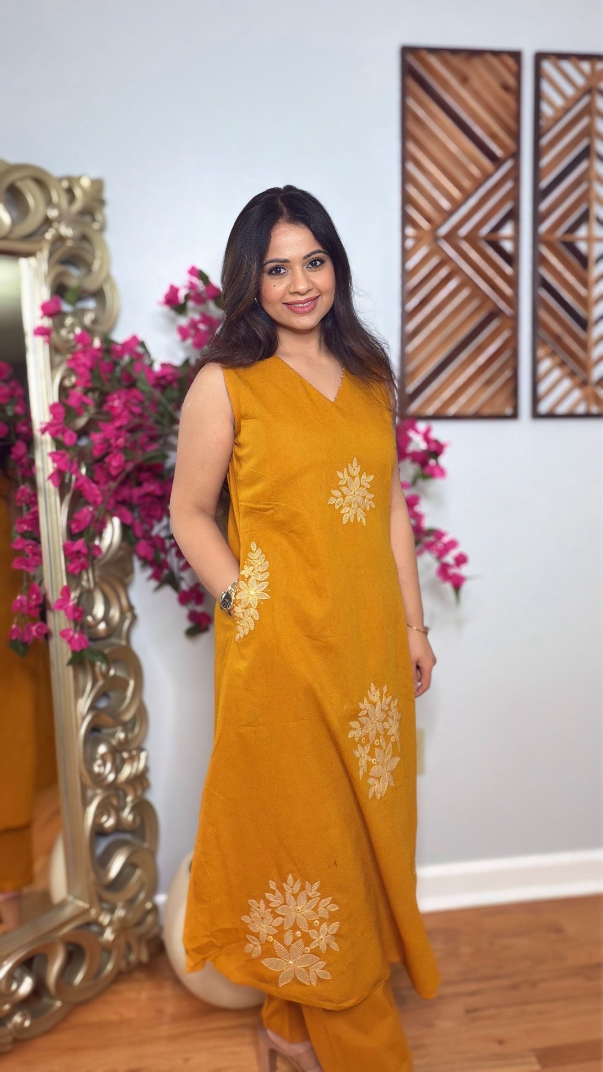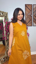 Elevate your everyday ethnic style with this beautifully crafted mustard embroidered kurta pant set. Designed with delicate floral thread embroidery across the front and pockets, this sleeveless kurta features a graceful A-line silhouette that blends comfort with elegance. The breathable linen fabric makes it perfect for warm weather while maintaining a polished and sophisticated look.