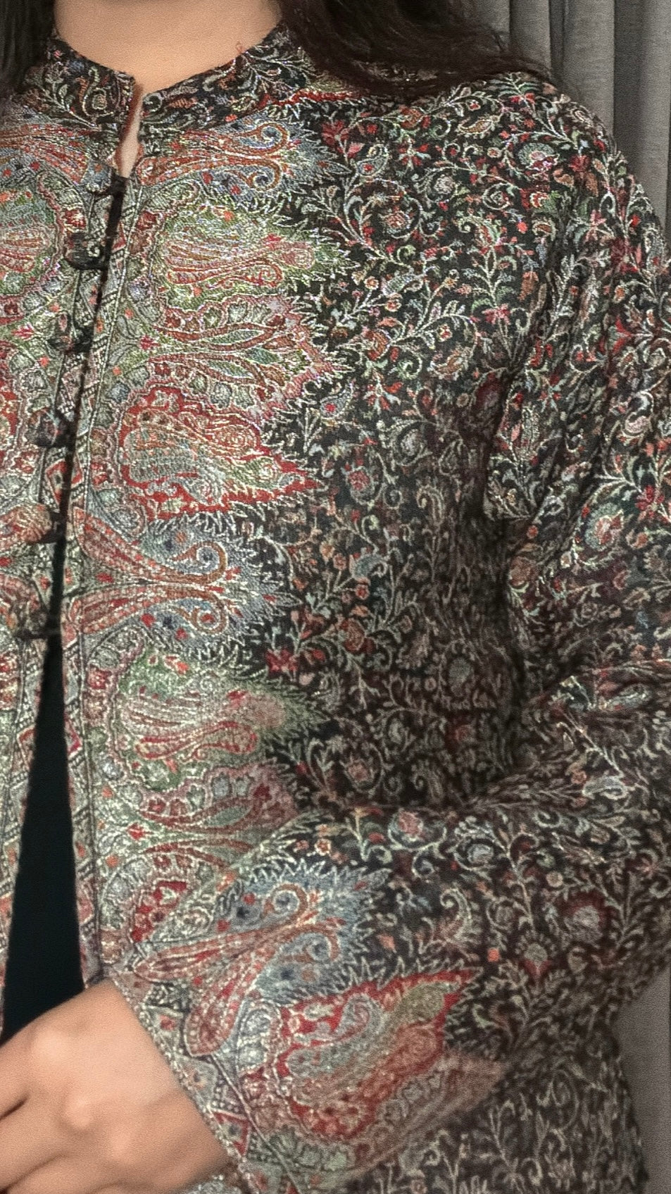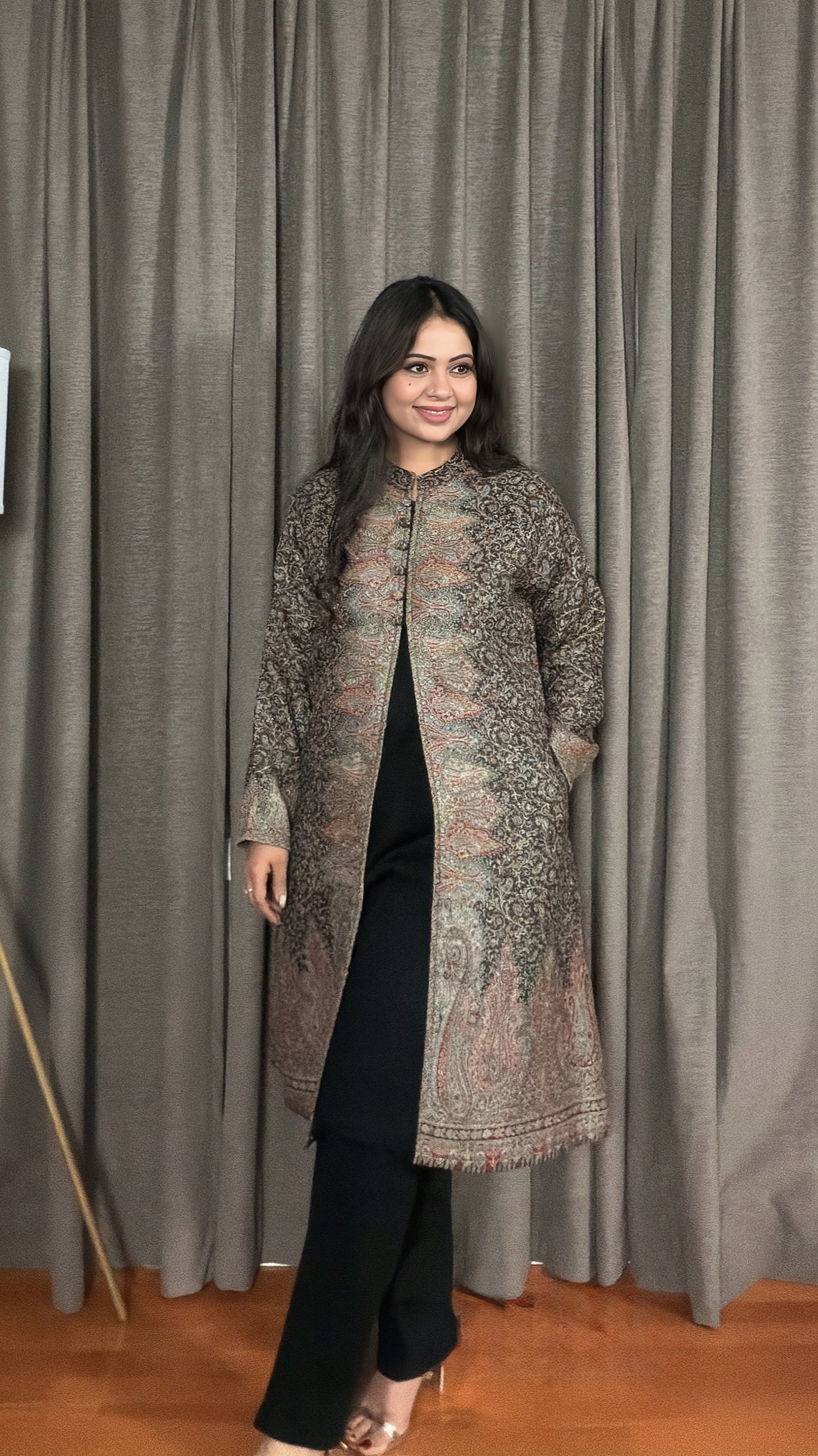 Grace meets grandeur in Zaarin, a luxurious Jamawar Pashmina coat suit designed to keep you warm and regal this winter. Crafted with rich kani woven patterns and zari detailing, it features a full inner lining that adds comfort without compromising on elegance. The timeless silhouette makes it a statement for festive evenings and winter occasions.