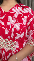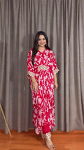 Zaiya radiates effortless elegance in a stunning red Chinon silk fabric with soft sheen and flow. The kaftan features intricate hand embroidery along the waistline and sleeve edges, adding a touch of festive glamour. Paired with matching pants for a modern Indo-Western look, it’s perfect for celebrations, get-togethers, or evening parties.
