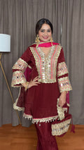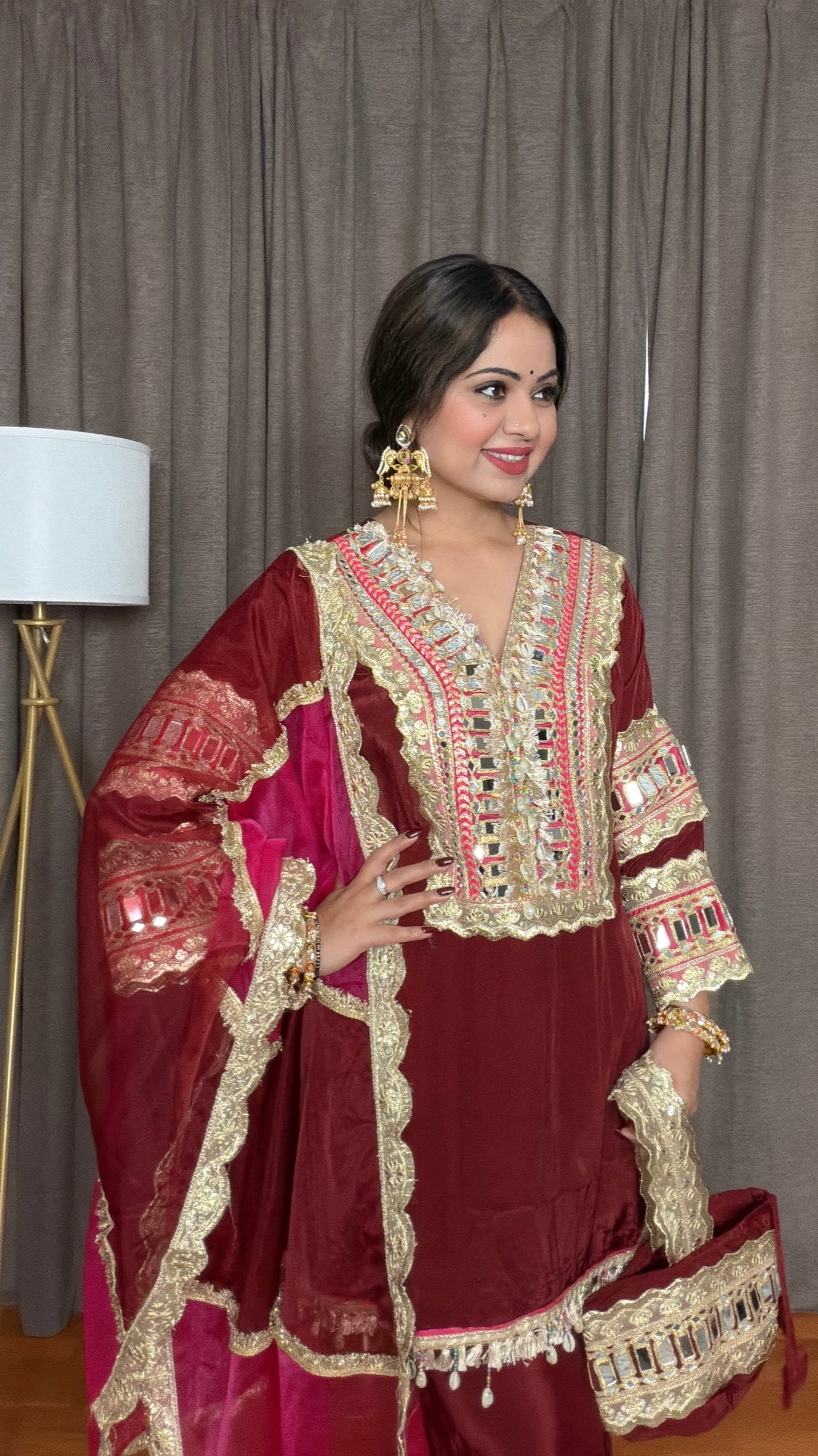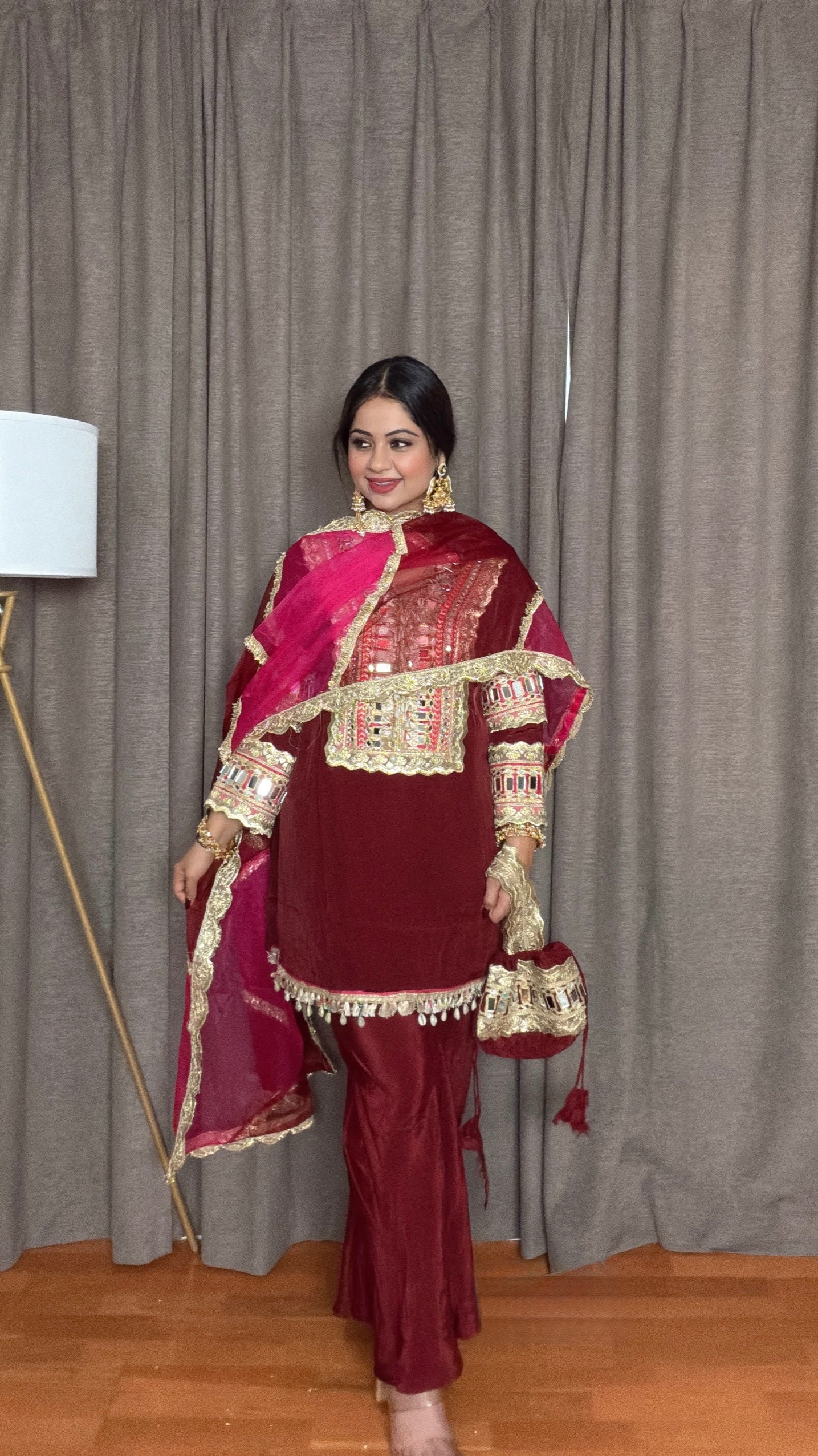 Radiate elegance with the Zareen Maroon Crepe Silk Palazzo Suit, a stunning blend of traditional artistry and modern chic. Made from soft, flowy crepe silk, it features intricate gotta and real mirror work on the neckline and sleeves that catch the light beautifully. The bell-bottom pants give it a contemporary twist, while the organza dupatta and matching potli bag complete the look with festive grace. Perfect as both a palazzo suit or coord set, Zareen is designed for celebrations that call for effortless sophistication.