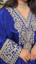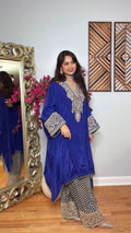 The statement kaftan features intricate embroidery on the neckline and sleeves, adding a touch of elegance, while the relaxed silhouette offers effortless comfort. Paired with a printed farshi salwar, this outfit is perfect for women who love modern yet rooted fashion.