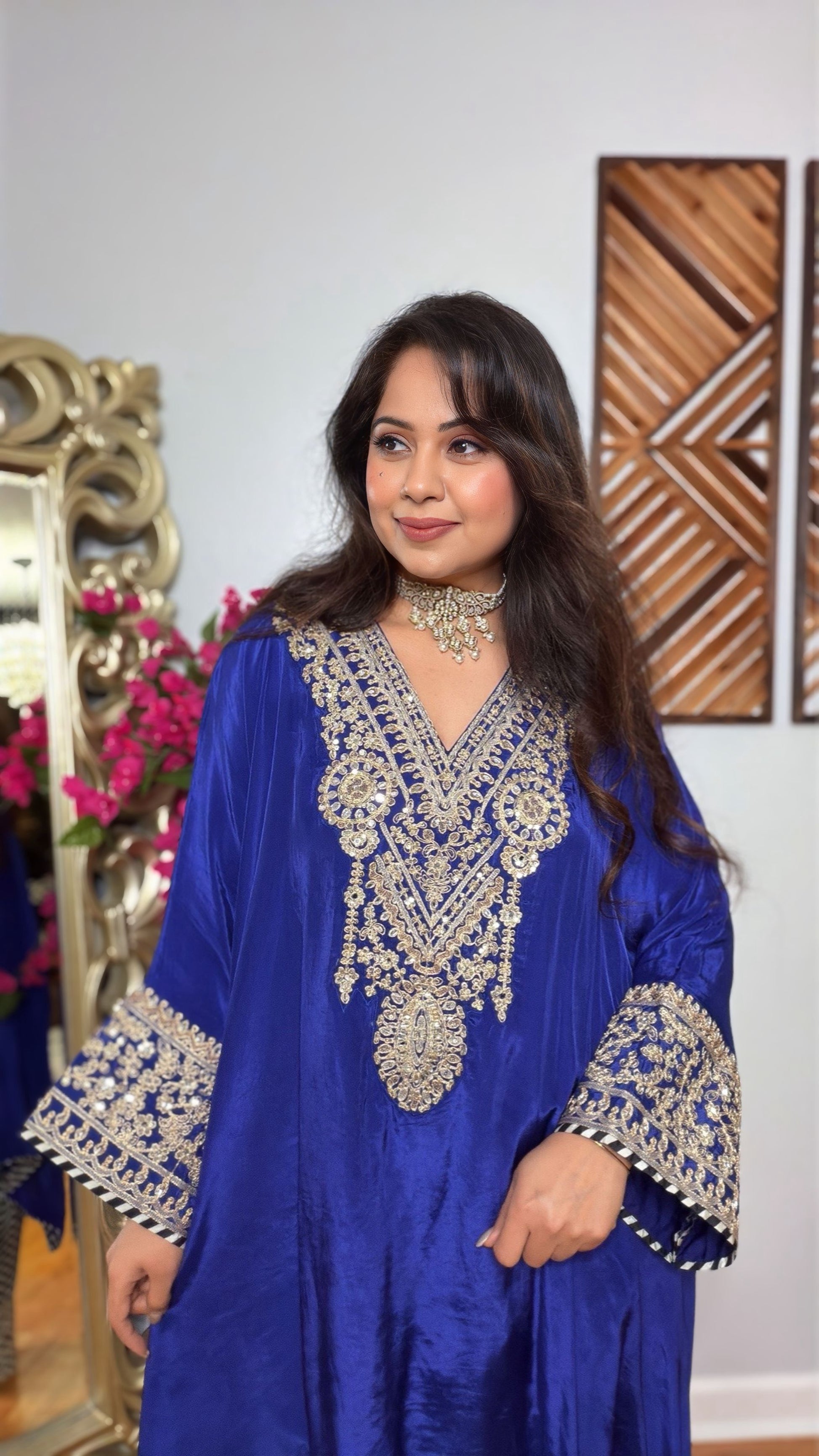 Redefine modern ethnic style with our Zayrra Indo Luxe Kaftan Set, crafted in premium crepe silk for a rich and fluid drape. This Indo-western ensemble blends contemporary kaftan styling with a traditional farshi salwar, creating a unique fusion look.