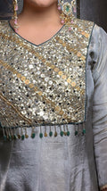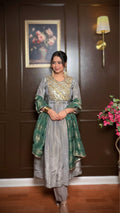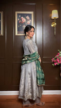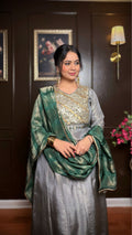 Zeya is a graceful A-line Anarkali crafted in soft tissue shimmer fabric, designed for elegant festive dressing. The subtle grey tone is beautifully complemented by intricate zari and hand embroidery on the bodice, adding a rich focal detail. The flowy silhouette drapes effortlessly, while the contrast green dupatta completes the look with a refined festive touch.